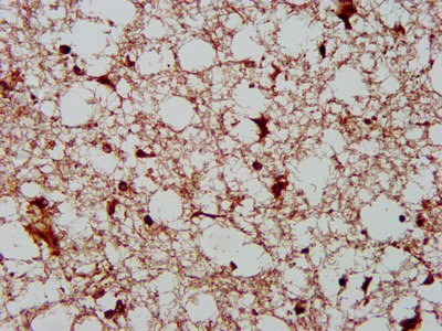 IHC image of CSB-PA812872LA01HU diluted at 1:400 and staining in paraffin-embedded human brain tissue performed on a Leica BondTM system. After dewaxing and hydration, antigen retrieval was mediated by high pressure in a citrate buffer (pH 6.0). Section was blocked with 10% normal goat serum 30min at RT. Then primary antibody (1% BSA) was incubated at 4°C overnight. The primary is detected by a biotinylated secondary antibody and visualized using an HRP conjugated SP system.