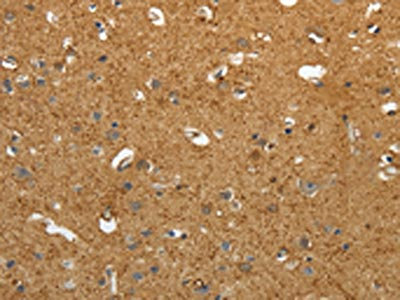 The image on the left is immunohistochemistry of paraffin-embedded Human brain tissue using CSB-PA610964(AKAP12 Antibody) at dilution 1/40, on the right is treated with synthetic peptide. (Original magnification: ×200)