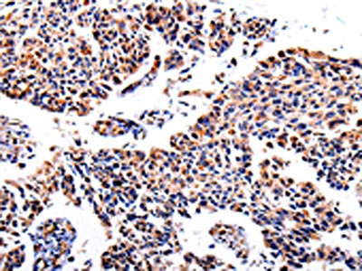 The image on the left is immunohistochemistry of paraffin-embedded Human lung cancer tissue using CSB-PA825868(AKR1B1 Antibody) at dilution 1/40, on the right is treated with fusion protein. (Original magnification: ×200)