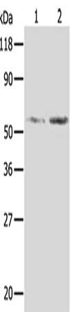 Gel: 10%SDS-PAGE, Lysate: 40 μg, Lane 1-2: Hela cells, 293T cells, Primary antibody: CSB-PA825868(AKR1B1 Antibody) at dilution 1/350, Secondary antibody: Goat anti rabbit IgG at 1/8000 dilution, Exposure time: 1 minute