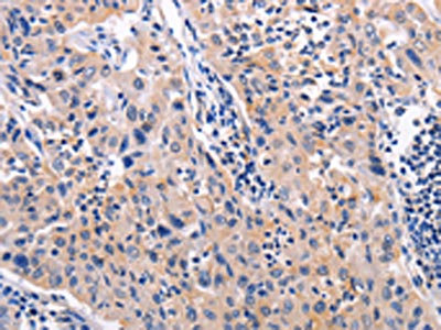 The image on the left is immunohistochemistry of paraffin-embedded Human lung cancer tissue using CSB-PA918257(AKR1B10 Antibody) at dilution 1/30, on the right is treated with fusion protein. (Original magnification: ×200)
