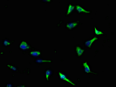 Immunofluorescence staining of SH-SY5Y cells with CSB-PA862043LA01HU at 1:140, counter-stained with DAPI. The cells were fixed in 4% formaldehyde, permeabilized using 0.2% Triton X-100 and blocked in 10% normal Goat Serum. The cells were then incubated with the antibody overnight at 4°C. The secondary antibody was Alexa Fluor 488-congugated AffiniPure Goat Anti-Rabbit IgG(H+L).