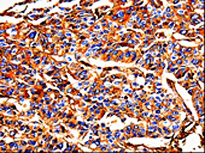 The image on the left is immunohistochemistry of paraffin-embedded Human liver cancer tissue using CSB-PA079344(ALB Antibody) at dilution 1/25, on the right is treated with fusion protein. (Original magnification: ×200)