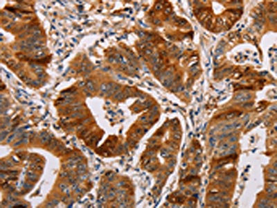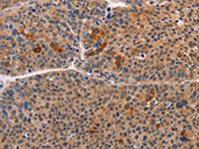 The image on the left is immunohistochemistry of paraffin-embedded Human gastic cancer tissue using CSB-PA272721(ALDH3A1 Antibody) at dilution 1/55, on the right is treated with fusion protein. (Original magnification: ×200)