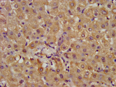 IHC image of CSB-PA001579LA01HU diluted at 1:400 and staining in paraffin-embedded human liver tissue performed on a Leica BondTM system. After dewaxing and hydration, antigen retrieval was mediated by high pressure in a citrate buffer (pH 6.0). Section was blocked with 10% normal goat serum 30min at RT. Then primary antibody (1% BSA) was incubated at 4°C overnight. The primary is detected by a biotinylated secondary antibody and visualized using an HRP conjugated SP system.