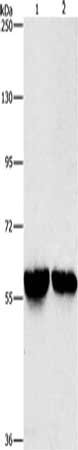 Gel: 8%SDS-PAGE, Lysate: 40 μg, Lane 1-2: Mouse liver tissue, Mouse kidney tissue, Primary antibody: CSB-PA842443(ALDH8A1 Antibody) at dilution 1/800, Secondary antibody: Goat anti rabbit IgG at 1/8000 dilution, Exposure time: 3 seconds