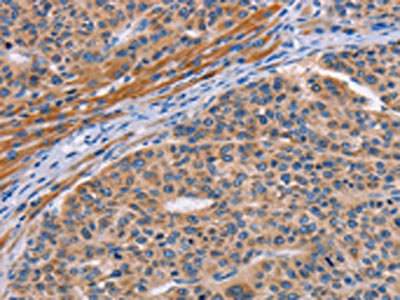 The image on the left is immunohistochemistry of paraffin-embedded Human liver cancer tissue using CSB-PA092883(ALG12 Antibody) at dilution 1/20, on the right is treated with fusion protein. (Original magnification: ×200)