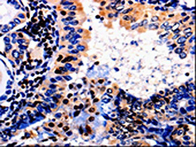 The image is immunohistochemistry of paraffin-embedded Human colon cancer tissue using CSB-PA043268(ALOX5 Antibody) at dilution 1/50. (Original magnification: ×200)