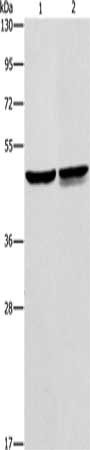 Gel: 8%SDS-PAGE, Lysate: 40 μg, Lane 1-2: A549 cells, Jurkat cells, Primary antibody: CSB-PA418436(AMACR Antibody) at dilution 1/350, Secondary antibody: Goat anti rabbit IgG at 1/8000 dilution, Exposure time: 15 seconds