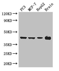 Positive WB detected in: PC-3 whole cell lysate, MCF-7 whole cell lysate, HepG2 whole cell lysate, Mouse brain tissue