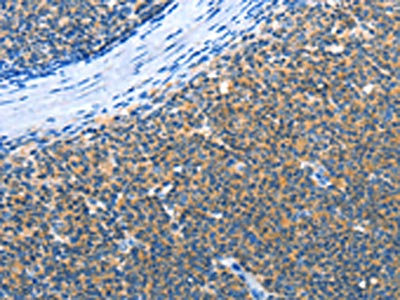 The image on the left is immunohistochemistry of paraffin-embedded Human lymphoma cancer tissue using CSB-PA984808(AMDHD2 Antibody) at dilution 1/30, on the right is treated with fusion protein. (Original magnification: ×200)