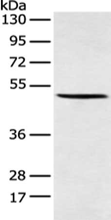 Gel: 8%SDS-PAGE, Lysate: 40 μg, Lane: Mouse adrenal gland tissue, Primary antibody: CSB-PA984808(AMDHD2 Antibody) at dilution 1/250 dilution, Secondary antibody: Goat anti rabbit IgG at 1/8000 dilution, Exposure time: 20 seconds