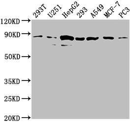 Positive WB detected in: 293T whole cell lysate, U251 whole cell lysate, HepG2 whole cell lysate, 293 whole cell lysate, A549 whole cell lysate, MCF-7 whole cell lysate, PC3 whole cell lysate
