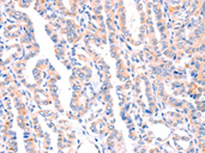 The image on the left is immunohistochemistry of paraffin-embedded Human thyroid cancer tissue using CSB-PA026505(AMPD1 Antibody) at dilution 1/70, on the right is treated with synthetic peptide. (Original magnification: ×200)