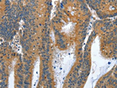 The image on the left is immunohistochemistry of paraffin-embedded Human colon cancer tissue using CSB-PA550582(ANAPC10 Antibody) at dilution 1/30, on the right is treated with fusion protein. (Original magnification: ×200)