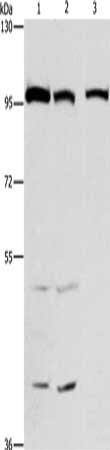 Gel: 6%SDS-PAGE, Lysate: 40 μg, Lane 1-3: HepG2 cells, 231 cells, hela cells, Primary antibody: CSB-PA135409(ANAPC4 Antibody) at dilution 1/300, Secondary antibody: Goat anti rabbit IgG at 1/8000 dilution, Exposure time: 1 minute