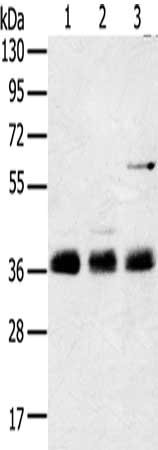 Gel: 8%SDS-PAGE, Lysate: 60 μg, Lane 1-3: Mouse lung tissue, NIH/3T3 cells, hepg2 cells, Primary antibody: CSB-PA562564(ANKRD1 Antibody) at dilution 1/400, Secondary antibody: Goat anti rabbit IgG at 1/8000 dilution, Exposure time: 3 seconds