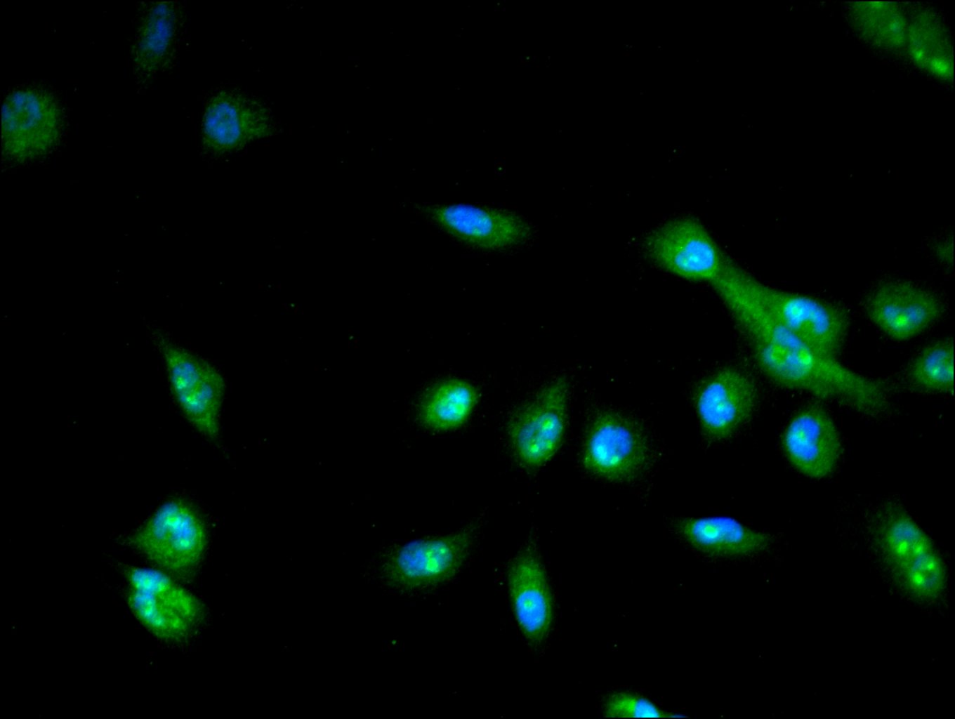 Immunofluorescence staining of U251 cell with CSB-PA757769LA01HU at 1:450, counter-stained with DAPI. The cells were fixed in 4% formaldehyde and blocked in 10% normal Goat Serum. The cells were then incubated with the antibody overnight at 4C. The secondary antibody was Alexa Fluor 488-congugated AffiniPure Goat Anti-Rabbit IgG(H+L).