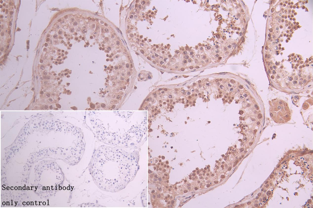 IHC image of CSB-PA757769LA01HU diluted at 1:700 and staining in paraffin-embedded human testis tissue performed on a Leica BondTM system. After dewaxing and hydration, antigen retrieval was mediated by high pressure in a citrate buffer (pH 6.0). Section was blocked with 10% normal goat serum 30min at RT. Then primary antibody (1% BSA) was incubated at 4°C overnight. The primary is detected by a Goat anti-rabbit polymer IgG labeled by HRP and visualized using 0.05% DAB. Secondary antibody only control: uses 1% BSA instead of primary antibody