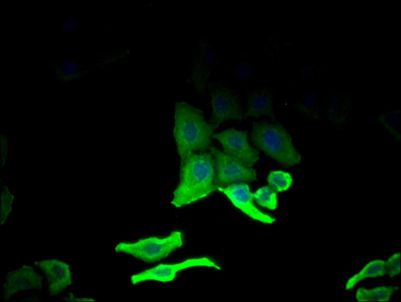 Immunofluorescence staining of Hela cell with CSB-PA001838EA01HU at 1:25, counter-stained with DAPI. The cells were fixed in 4% formaldehyde and blocked in 10% normal Goat Serum. The cells were then incubated with the antibody overnight at 4C. The secondary antibody was Alexa Fluor 488-congugated AffiniPure Goat Anti-Rabbit IgG(H+L).