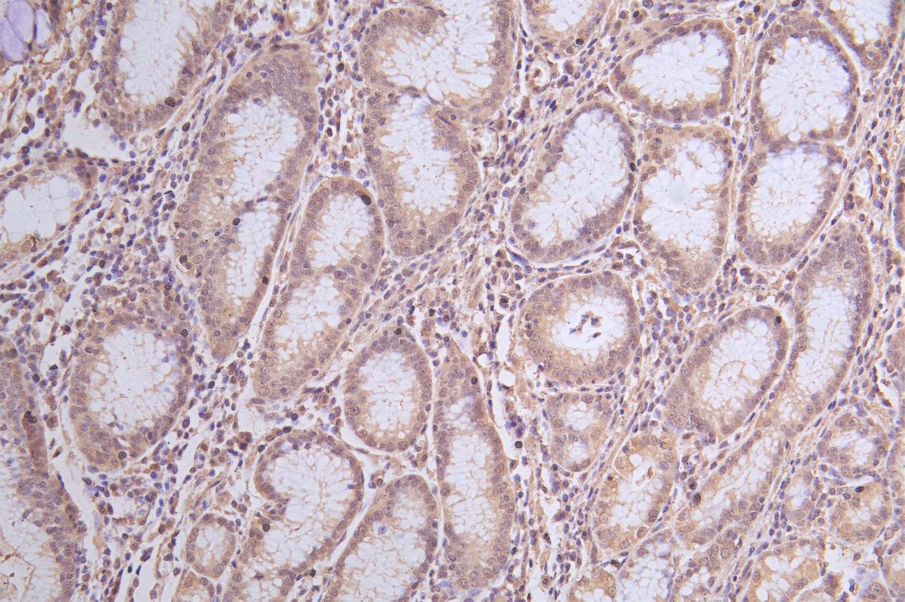 IHC image of CSB-PA001838EA01HU diluted at 1:50 and staining in paraffin-embedded human gastric cancer performed on a Leica BondTM system. After dewaxing and hydration, antigen retrieval was mediated by high pressure in a citrate buffer (pH 6.0). Section was blocked with 10% normal goat serum 30min at RT. Then primary antibody (1% BSA) was incubated at 4°C overnight. The primary is detected by a Goat anti-rabbit polymer IgG labeled by HRP and visualized using 0.05% DAB.