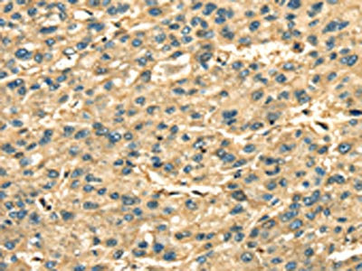 The image on the left is immunohistochemistry of paraffin-embedded Human liver cancer tissue using CSB-PA081479(ANXA2 Antibody) at dilution 1/35, on the right is treated with fusion protein. (Original magnification: ×200)