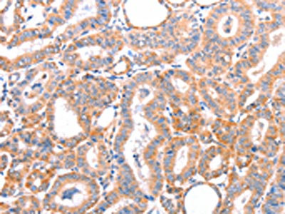 The image on the left is immunohistochemistry of paraffin-embedded Human thyroid cancer tissue using CSB-PA104599(AOC1 Antibody) at dilution 1/15, on the right is treated with fusion protein. (Original magnification: ×200)