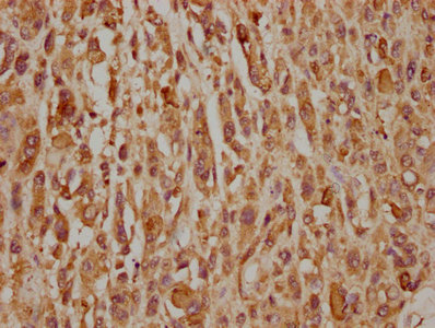 IHC image of CSB-PA001898LA01HU diluted at 1:320 and staining in paraffin-embedded human melanoma cancer performed on a Leica BondTM system. After dewaxing and hydration, antigen retrieval was mediated by high pressure in a citrate buffer (pH 6.0). Section was blocked with 10% normal goat serum 30min at RT. Then primary antibody (1% BSA) was incubated at 4°C overnight. The primary is detected by a biotinylated secondary antibody and visualized using an HRP conjugated SP system.