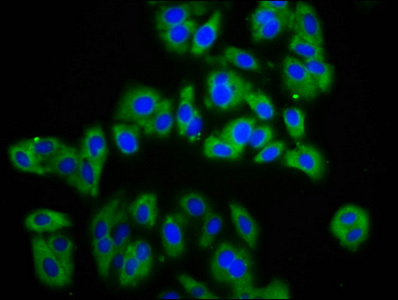 Immunofluorescence staining of HepG2 cells with CSB-PA884629LA01HU at 1:133, counter-stained with DAPI. The cells were fixed in 4% formaldehyde, permeabilized using 0.2% Triton X-100 and blocked in 10% normal Goat Serum. The cells were then incubated with the antibody overnight at 4°C. The secondary antibody was Alexa Fluor 488-congugated AffiniPure Goat Anti-Rabbit IgG(H+L).