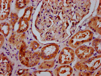IHC image of CSB-PA884629LA01HU diluted at 1:400 and staining in paraffin-embedded human kidney tissue performed on a Leica BondTM system. After dewaxing and hydration, antigen retrieval was mediated by high pressure in a citrate buffer (pH 6.0). Section was blocked with 10% normal goat serum 30min at RT. Then primary antibody (1% BSA) was incubated at 4°C overnight. The primary is detected by a biotinylated secondary antibody and visualized using an HRP conjugated SP system.