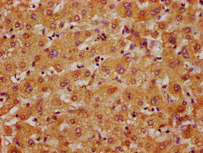 IHC image of CSB-PA884629LA01HU diluted at 1:400 and staining in paraffin-embedded human liver tissue performed on a Leica BondTM system. After dewaxing and hydration, antigen retrieval was mediated by high pressure in a citrate buffer (pH 6.0). Section was blocked with 10% normal goat serum 30min at RT. Then primary antibody (1% BSA) was incubated at 4°C overnight. The primary is detected by a biotinylated secondary antibody and visualized using an HRP conjugated SP system.