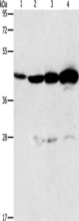 Gel: 12%SDS-PAGE, Lysate: 40 μg, Lane 1-4: Mouse thymus tissue, A549 cells, Lovo cells, K562 cells, Primary antibody: CSB-PA620593(APOBEC3D Antibody) at dilution 1/580, Secondary antibody: Goat anti rabbit IgG at 1/8000 dilution, Exposure time: 30 seconds