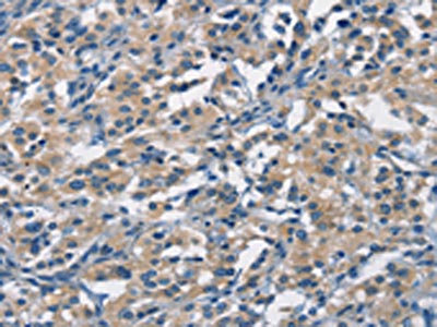 The image on the left is immunohistochemistry of paraffin-embedded Human gastic cancer tissue using CSB-PA082663(APOL1 Antibody) at dilution 1/40, on the right is treated with synthetic peptide. (Original magnification: ×200)