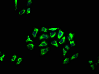 Immunofluorescence staining of Hela cells with CSB-PA853458LA01HU at 1:66, counter-stained with DAPI. The cells were fixed in 4% formaldehyde, permeabilized using 0.2% Triton X-100 and blocked in 10% normal Goat Serum. The cells were then incubated with the antibody overnight at 4°C. The secondary antibody was Alexa Fluor 488-congugated AffiniPure Goat Anti-Rabbit IgG(H+L).