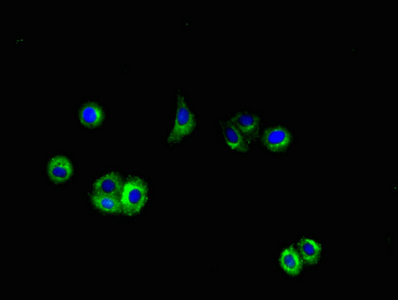 Immunofluorescent analysis of HepG2 cells using CSB-PA07179A0Rb at dilution of 1:100 and Alexa Fluor 488-congugated AffiniPure Goat Anti-Rabbit IgG(H+L)