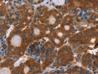 The image on the left is immunohistochemistry of paraffin-embedded Human thyroid cancer tissue using CSB-PA891395(APP Antibody) at dilution 1/25, on the right is treated with fusion protein. (Original magnification: ×200)