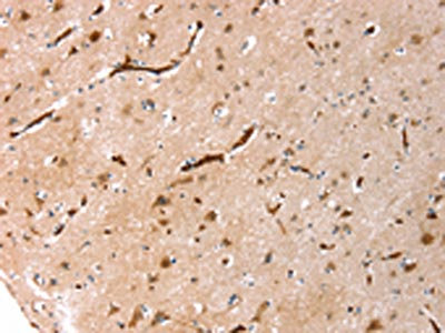 The image on the left is immunohistochemistry of paraffin-embedded Human brain tissue using CSB-PA990867(AQP1 Antibody) at dilution 1/20, on the right is treated with synthetic peptide. (Original magnification: ×200)