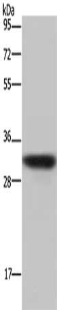 Gel: 10%SDS-PAGE, Lysate: 40 μg, Lane: Mouse kidney tissue, Primary antibody: CSB-PA905782(AQP4 Antibody) at dilution 1/200, Secondary antibody: Goat anti rabbit IgG at 1/8000 dilution, Exposure time: 5 minutes
