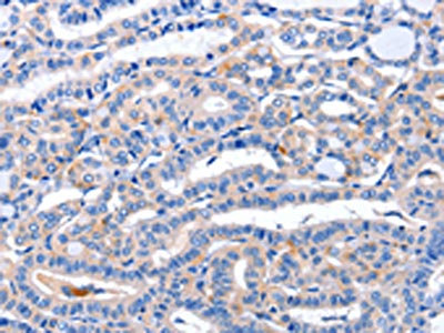 The image on the left is immunohistochemistry of paraffin-embedded Human thyroid cancer tissue using CSB-PA056943(AR Antibody) at dilution 1/20, on the right is treated with synthetic peptide. (Original magnification: ×200)