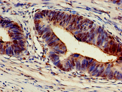 Immunohistochemistry of paraffin-embedded human colon cancer using CSB-PA00915A0Rb at dilution of 1:100