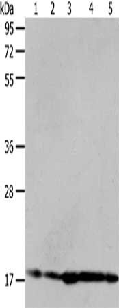 Gel: 8%SDS-PAGE, Lysate: 40 μg, Lane 1-5: Hela cells, 293T cells, mouse liver tissue, A431 cells, MCF7 cells, Primary antibody: CSB-PA129669(ARF6 Antibody) at dilution 1/450, Secondary antibody: Goat anti rabbit IgG at 1/8000 dilution, Exposure time: 40 seconds
