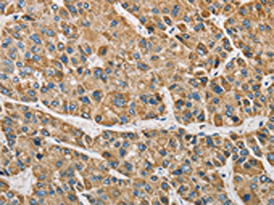 The image on the left is immunohistochemistry of paraffin-embedded Human liver cancer tissue using CSB-PA999330(ARHGAP25 Antibody) at dilution 1/40, on the right is treated with fusion protein. (Original magnification: ×200)