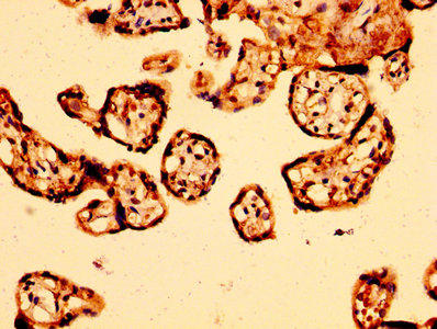 IHC image of CSB-PA002043LA01HU diluted at 1:500 and staining in paraffin-embedded human placenta tissue performed on a Leica BondTM system. After dewaxing and hydration, antigen retrieval was mediated by high pressure in a citrate buffer (pH 6.0). Section was blocked with 10% normal goat serum 30min at RT. Then primary antibody (1% BSA) was incubated at 4°C overnight. The primary is detected by a biotinylated secondary antibody and visualized using an HRP conjugated SP system.