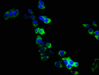 Immunofluorescence staining of PC3 cells with CSB-PA019681HA01HU at 1:133, counter-stained with DAPI. The cells were fixed in 4% formaldehyde, permeabilized using 0.2% Triton X-100 and blocked in 10% normal Goat Serum. The cells were then incubated with the antibody overnight at 4°C. The secondary antibody was Alexa Fluor 488-congugated AffiniPure Goat Anti-Rabbit IgG(H+L).