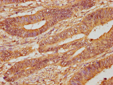 IHC image of CSB-PA019681HA01HU diluted at 1:200 and staining in paraffin-embedded human colon cancer performed on a Leica BondTM system. After dewaxing and hydration, antigen retrieval was mediated by high pressure in a citrate buffer (pH 6.0). Section was blocked with 10% normal goat serum 30min at RT. Then primary antibody (1% BSA) was incubated at 4°C overnight. The primary is detected by a biotinylated secondary antibody and visualized using an HRP conjugated SP system.