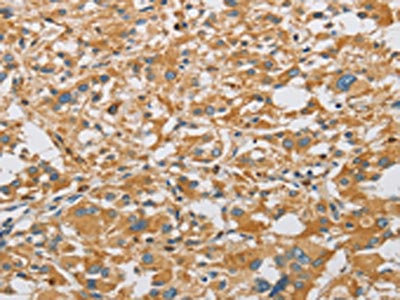 The image on the left is immunohistochemistry of paraffin-embedded Human gastric cancer tissue using CSB-PA600132(ARHGEF7 Antibody) at dilution 1/40, on the right is treated with fusion protein. (Original magnification: ×200)