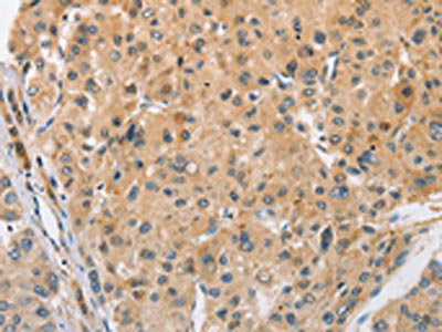 The image on the left is immunohistochemistry of paraffin-embedded Human liver cancer tissue using CSB-PA919511(ARL8A Antibody) at dilution 1/25, on the right is treated with fusion protein. (Original magnification: ×200)