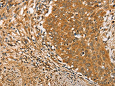 The image on the left is immunohistochemistry of paraffin-embedded Human cervical cancer tissue using CSB-PA916723(ARMCX3 Antibody) at dilution 1/40, on the right is treated with fusion protein. (Original magnification: ×200)