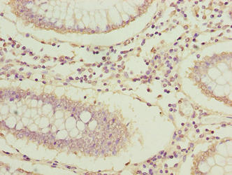 Immunohistochemistry of paraffin-embedded human colon cancer using CSB-PA773801LA01HU at dilution of 1:100