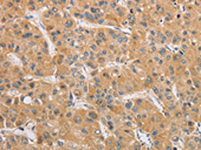 The image on the left is immunohistochemistry of paraffin-embedded Human liver cancer tissue using CSB-PA906091(ARSK Antibody) at dilution 1/20, on the right is treated with fusion protein. (Original magnification: ×200)